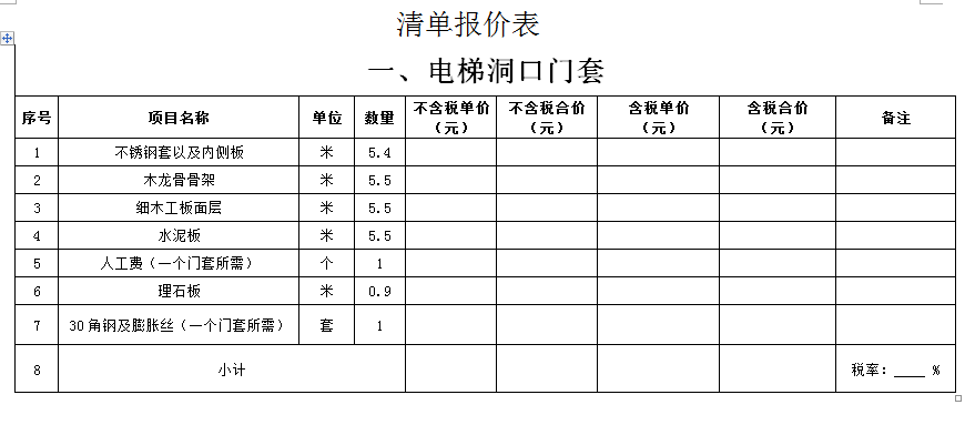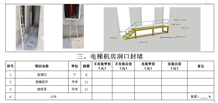 (5)采購(gòu)范圍:電梯洞口門套、鋼爬梯、電梯機(jī)房洞口封堵、包轎廂、地面找平、地下車庫(kù)出入口真石漆等(詳見清單)等相關(guān)工作,具體內(nèi)容詳見采購(gòu)文件。